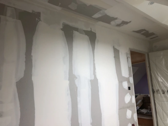 2. Collage de bande plate et cornière d'angle. Rebouche des vis et 1ère passe de bande. Etat du support : Début de la platrerie